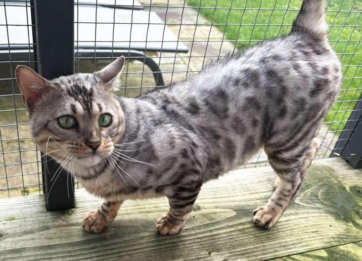 He is a silver rosetted spotted Bengal boy. He is just a big, daft, soppy boy who adores everyone that he meets. When he was recently neutered, all of the staff at the vets were swooning over him. He is going to make an incredible pet and companion.